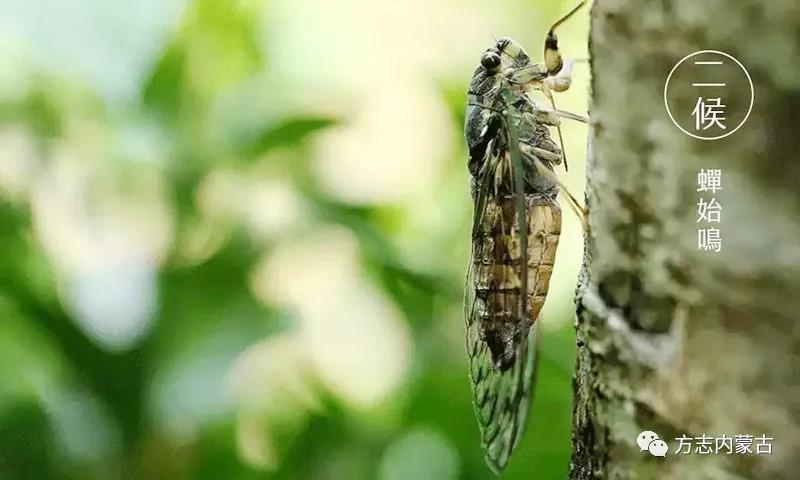 二候蜩始鳴:蜩即夏蟬,俗稱“知了”,夏至后因感陰氣生,雄性的知了便鼓翼而鳴。