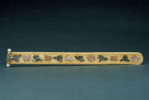 鈿花 鈿子上所鑲嵌之花,俗稱面簪。多用金、銀、玉石、珍珠、珊瑚、琥珀、瑪瑙、松耳石等為原材料,制成二龍戲珠、翔鳳、蝴蝶、葵花、菊花、桂花、如意、云紋等式樣,并以單件的鈿花合為一組,鑲嵌鈿上。20世紀(jì)50年代,該頭飾在內(nèi)蒙古滿族婦女中逐漸消失。