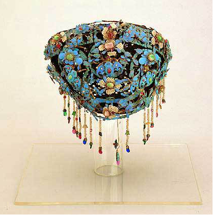 鈿子 清代滿族婦女的彩冠,俗稱鳳鈿。其狀如平頂帽,鐵絲或竹藤作骨,制成帽架,黑綢或紗線網(wǎng)罩其外,鈿上鑲嵌精美的鈿花,多為9片、7片或5片;鈿子前后垂飾旒蘇,長及于肩。20世紀(jì)50年代,該頭飾在內(nèi)蒙古滿族婦女中逐漸消失。