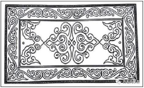 額布爾紋即犄形紋。蒙古語全稱為“額布爾·烏嘎拉吉”。額布爾紋是蒙古族動物紋圖案中最常見的一種紋樣。所謂額布爾紋,即指用獸角為原型構(gòu)成的一種裝飾紋飾。額布爾紋作為蒙古族圖案花紋的一種最為基本的母題式樣,可以構(gòu)成中心紋飾、邊緣紋飾、角隅紋飾等這些最具典型的蒙古族紋飾。額布爾紋根據(jù)形制構(gòu)造上的差別,大致也可劃分為以下四個種類。第一種是由動物犄角、頭部以及動物的眼睛等三部分構(gòu)成。每對犄角都分為上下兩層,上一層犄角為向上彎曲的半弧線,下一層犄角為水平的直線。每對犄角的上層相互銜接,每對犄角的下層也相互銜接,形成穹廬似的連續(xù)額布爾紋。第二種是由動物頭部、動物犄角,以及動物的耳朵等三部分構(gòu)成。該類紋樣中犄角的長度與動物的頭部等同,是由兩條線在中途合而為一,后向下彎曲而成,同時,每對彎曲的犄角相互勾聯(lián),形成橢圓形的額布爾紋。第三種是由動物頭部加動物犄角而構(gòu)成。但這一類額布爾紋通過封閉的復(fù)線,將動物的頭部和犄角合為一個鏤空的整體。