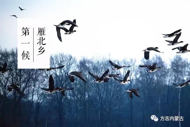 一候雁北鄉(xiāng)。小寒二陽之際,雖然是冰天雪地,但是陽氣已動,因此候鳥大雁感陽出現(xiàn)向北飛的跡象。