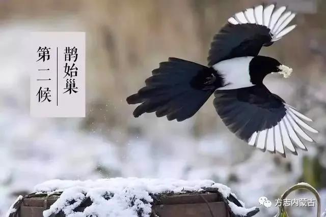 二候鵲始巢。禽鳥最早得知氣候變化,此時喜鵲已得來年之氣,開始銜草筑巢,準備孕育后代。