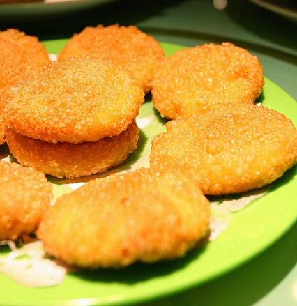 油炸糕是將黃米面蒸熟,揉成一塊叫素糕,捏成圓片或包以豆、菜餡,用油炸叫作炸糕。20世紀(jì)50年代前,一年難得吃一頓油炸糕、白面饅頭和肉餡餃子。逢年過節(jié),蓋房壓棧,紅白喜事,則一定要吃油炸糕。