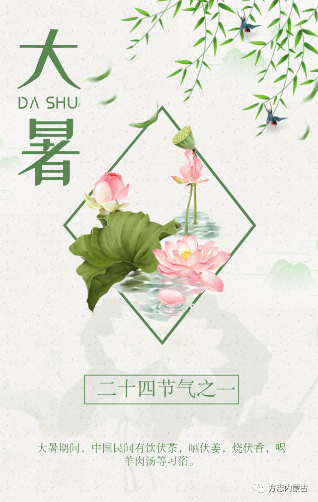 大暑在農(nóng)歷二十四節(jié)氣中排第十二,夏季最后一個(gè)節(jié)氣,正值“三伏”,時(shí)間在每年7月22—24日之間。是中國一年中日照最多、氣溫最高的時(shí)期,全國大部分地區(qū)干旱少雨,許多地區(qū)的氣溫達(dá)35度以上,也是喜熱作物生長速度最快的時(shí)期。