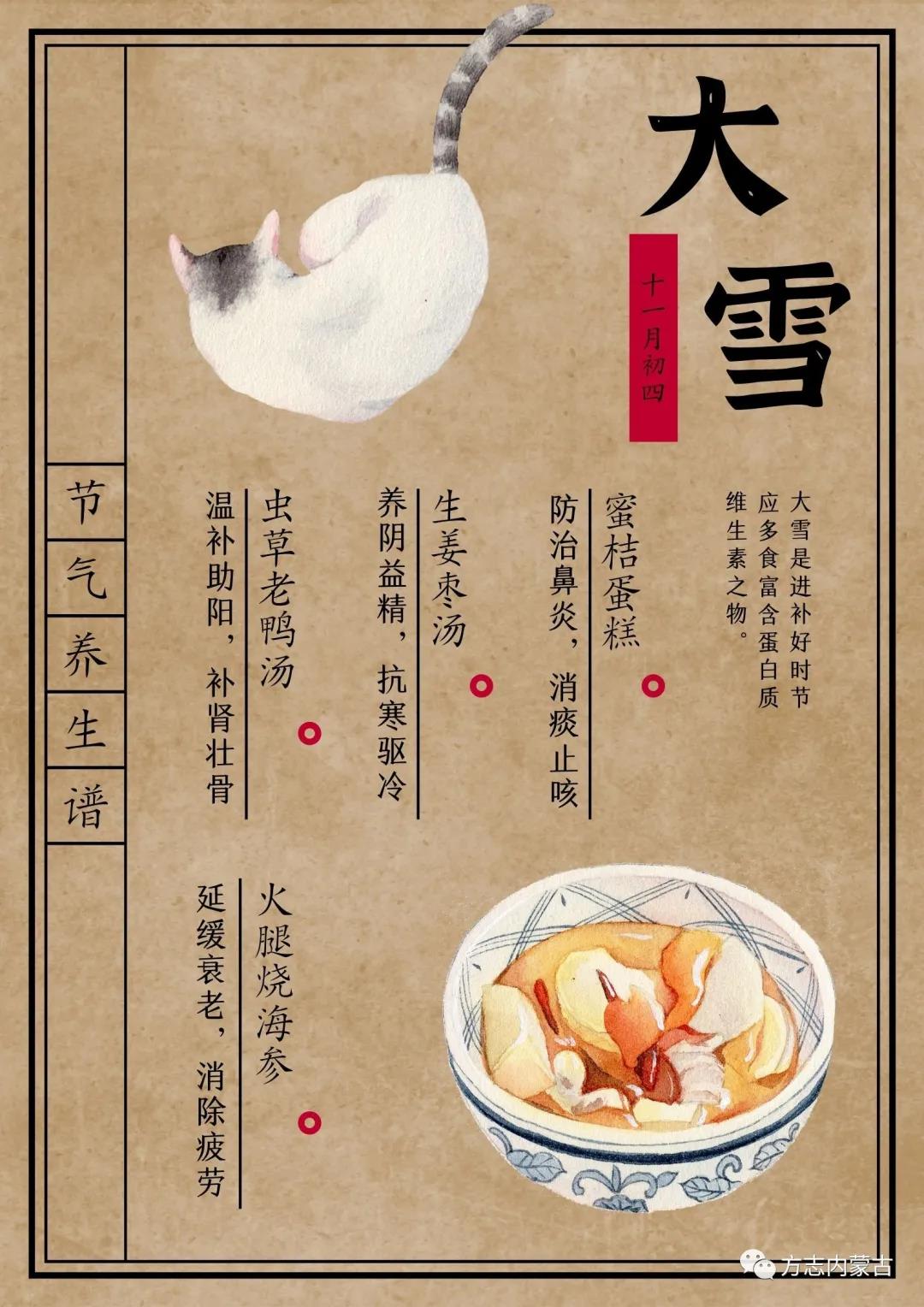 大雪是“進(jìn)補(bǔ)”的好時(shí)節(jié),素有“冬天進(jìn)補(bǔ),開(kāi)春打虎”的說(shuō)法。冬令進(jìn)補(bǔ)能提高人體的免疫功能,促進(jìn)新陳代謝,使畏寒的現(xiàn)象得到改善。冬令進(jìn)補(bǔ)還能調(diào)節(jié)體內(nèi)的物質(zhì)代謝,使?fàn)I養(yǎng)物質(zhì)轉(zhuǎn)化的能量最大限度地貯存于體內(nèi),有助于體內(nèi)陽(yáng)氣的升發(fā),俗話說(shuō)“三九補(bǔ)一冬,來(lái)年無(wú)病痛”。此時(shí)宜溫補(bǔ)助陽(yáng)、補(bǔ)腎壯骨、養(yǎng)陰益精。冬季食補(bǔ)應(yīng)供給富含蛋白質(zhì)、維生素和易于消化的食物。大雪節(jié)氣前后,柑桔類水果大量上市,像南豐蜜桔、官溪柚子、臍橙血橙都是現(xiàn)在的當(dāng)家水果。適當(dāng)食用可以防治鼻炎,消痰止咳。