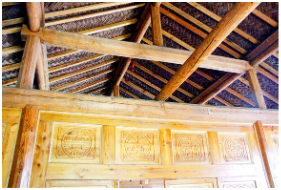 居室南、西面開窗,利于采光。窗格花紋組合講究。內(nèi)室門多是雕花油漆隔扇式,美觀結(jié)實(shí)。四壁飾有雞、鳳、鵪鶉及狩獵等圖案、剪紙,也有直接貼雉羽、皮毛作為點(diǎn)綴。炕墻木板畫有彩繪。倉房為木制閣樓,距地面1米左右,通風(fēng)干燥,宜于存儲(chǔ)物品。