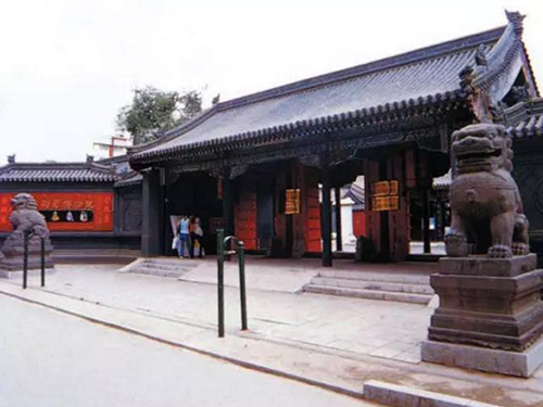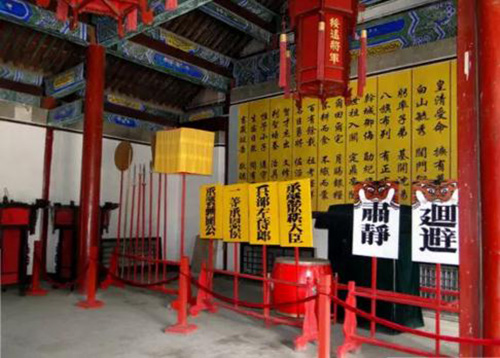 府門(mén)前有巨型石獅一對(duì),左雄右雌,雄獅滾繡球,雌獅弄幼崽,森嚴(yán)中不失諧趣。石獅左右分別為鐘亭、鼓亭。鐘鼓亭向南建有守衛(wèi)處,鼓手房。由此到照壁間由扇形鹿角架圍墻和牌坊門(mén)(又稱轅門(mén))連接。從衙署府門(mén)到大照壁之間形成一個(gè)呈四方形的小廣場(chǎng),是衙署的外院,主要用于保護(hù)衙署。