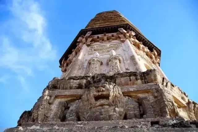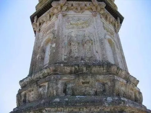 底座上為塔身。塔身一層?xùn)|、西、南、北四面正中均有磚砌拱形佛龕。龕內(nèi)佛像已全部脫落無存。其余四面設(shè)神龕,均為浮雕而成,龕內(nèi)各雕兩尊高1.66米的脅侍菩薩,菩薩立于蓮臺(tái)之上,人物形象生動(dòng)逼真。佛龕上方雕有飛天,其雕刻手法精湛,動(dòng)感強(qiáng)烈。塔身的轉(zhuǎn)角雕成圓柱形,再上為磚雕斗拱。二層以上均為密檐,每層除磚砌墻體,檐下均以四層疊澀磚墊托。塔剎為小塔式,南面雕有佛龕。剎頂有磚雕日、月、寶珠、火焰。