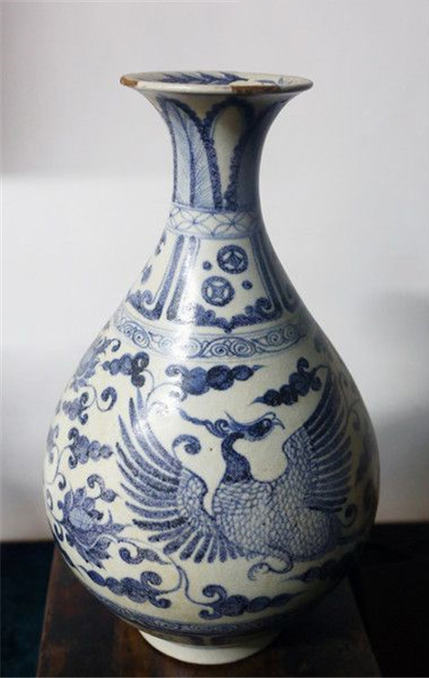此瓶造型精美,色調(diào)明快。敞口,頸細(xì)長,廣圓腹,圈足外撇。高度29.5厘米,口徑8.5厘米。最大腹徑15.3厘米,足徑9.4厘米。瓶身遍布青花,筆劃流暢。多而不亂。頸腹之間遍纏花卉,花叢中是栩栩如生的鳳凰來儀圖。鳳凰比翼雙飛,一派吉祥景象。此瓶釉色細(xì)潤,白里透青,晶瑩鮮亮。據(jù)考,為江西景德鎮(zhèn)官窯所燒制,實(shí)為元代青花瓷器之上乘精品。元代青花玉壺春瓶是1988年9月,哲里木盟(今通遼市)文物普查隊(duì)在科左中旗腰林毛都蘇木中心小學(xué)教師昭那斯吐家征集到的傳世文物,現(xiàn)存于哲里木盟博物館。