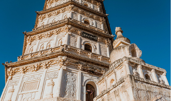 佛塔7層共設(shè)假門28個,每門兩旁都有天王浮雕一尊,全塔共有天王浮雕56尊,天王頭戴兜鍪,身披鎧甲,手持寶劍或利斧等兵器,威風凜凜,形象生動。其余嵌有經(jīng)幢的第三、第四兩層每面有浮雕佛陀二尊,共16尊。其上三層經(jīng)幢,兩側(cè)有升騰狀如意云24朵。拱眼和假窗四周,以及塔體七層八面的門拱和角柱內(nèi)側(cè)均有寶花、飛天、升龍、祥云、華蓋、迦樓羅、獅子、大象、麒麟、胡人獻寶、伎人樂舞等,內(nèi)容豐富、形象生動的磚刻浮雕。此外,在塔底的塔座主體上還設(shè)有佛龕64座,內(nèi)有菩薩坐像各一尊,菩薩坐像,造型優(yōu)美、雕工精巧,均為漢白玉浮雕而成。可惜這些雕像在清代之前均已脫落散失。1989年在清理塔基過程中,從塔旁清代維修時堆積的建筑廢物中發(fā)現(xiàn)幾尊殘件,維修時又將其復嵌于龕內(nèi)。