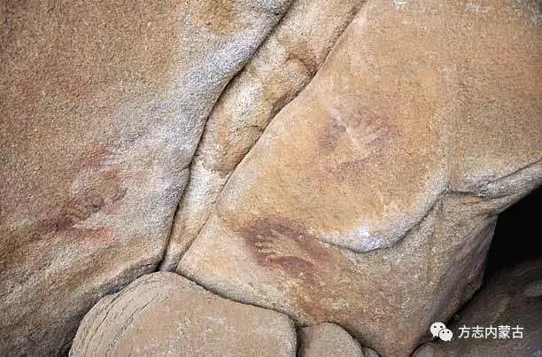 據(jù)考察,繪在陶乃高勒洞窟東側立壁上的兩個手印尤為醒目,色彩渾厚,紫中泛藍,畫面古樸自然,手印清晰。