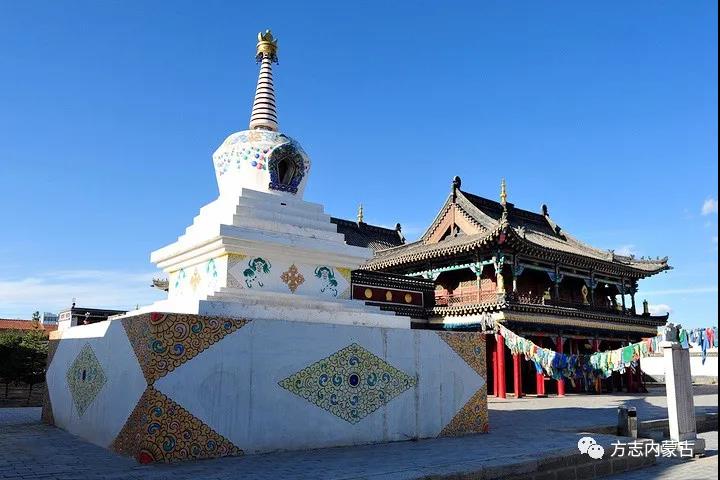 百靈廟始建于清康熙四十二年(1702)。廟宇由5座大殿、9座佛塔和30處藏式結(jié)構(gòu)的院落組成,總占地面積約8000余平方米。清康熙皇帝御賜“廣福寺”牌匾懸掛于大佛殿正門上方,其中有些殿堂近似內(nèi)地宮殿里的大殿結(jié)構(gòu)。外觀白壁尖頂金色,內(nèi)部雕梁畫棟,圖案新穎,造型優(yōu)美;還有一些建筑物則是以藏式平頂白墻建筑。在這些建筑中,蘇古沁大殿(大雄寶殿)是該寺最大的,它是三座連串逐級降低的建筑,每座殿頂置有象征佛法的塔形“甘迪爾”和東西兩側(cè)有日月相照的赤銅“甘迪爾”。在大草原上,差不多數(shù)十里外可以看到它的光輝和巨大。