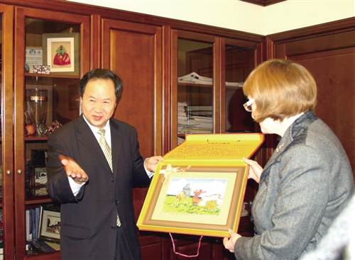 自治區(qū)旅游局副巡視員鄭家寧(左)將內(nèi)蒙古民族工藝品皮畫(huà)贈(zèng)與新西伯利亞州州政府副主席瑪恰諾娃女士。