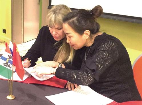 滿洲里市口岸國(guó)際旅行社副總金萍(右)與俄企業(yè)簽約。