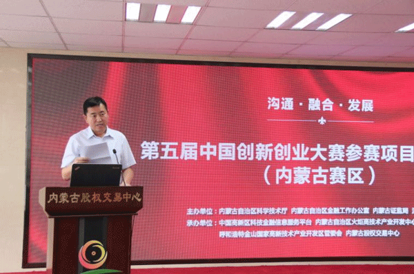 自治區(qū)科技廳副廳長張志寬、自治區(qū)金融辦副主任付振勇分別為第五屆中國創(chuàng)新創(chuàng)業(yè)大賽(內(nèi)蒙古賽區(qū))參賽項目投融資路演致辭。