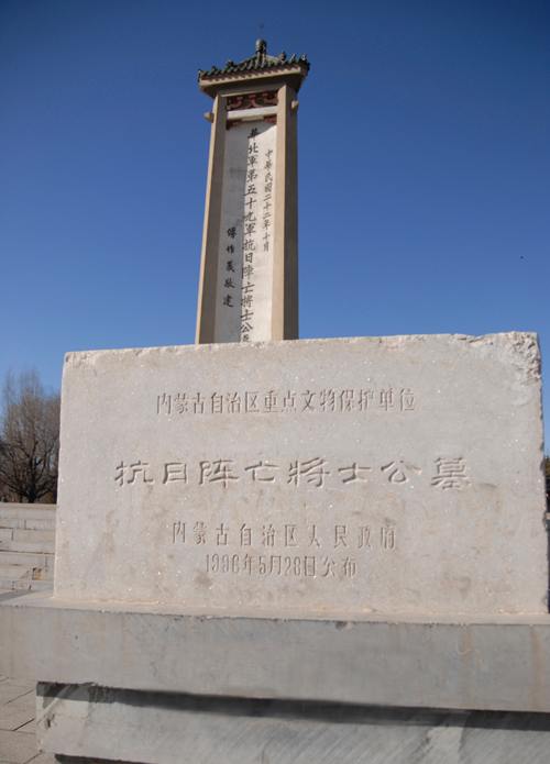 綏遠抗日將士紀念碑矗立在呼和浩特市公主府公園南端。長眠在這座高大的烈士紀念碑下的是華北軍第59軍367位與日本侵略軍浴血奮戰(zhàn)壯烈犧牲的愛國英靈。半個多世紀過去了,碑體完好,英烈的民族精魂永存不滅。
