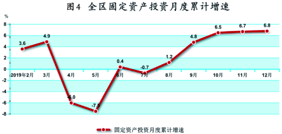 企業(yè)杠桿率進(jìn)一步下降,2019年,全區(qū)規(guī)模以上工業(yè)企業(yè)資產(chǎn)負(fù)債率為61.0%,比上年降低2.3個(gè)百分點(diǎn);商品房待售面積比上年下降13.9%,這是自2016年以來(lái)的連續(xù)4年下降;規(guī)模以上工業(yè)企業(yè)每百元營(yíng)業(yè)收入成本為80.1元,低于全國(guó)平均水平4元;補(bǔ)短板持續(xù)發(fā)力,基礎(chǔ)設(shè)施投資增長(zhǎng)1.1%,交通運(yùn)輸、倉(cāng)儲(chǔ)和郵政業(yè)投資增長(zhǎng)15.8%,社會(huì)領(lǐng)域投資增長(zhǎng)6.7%,生態(tài)保護(hù)和環(huán)境治理業(yè)投資增長(zhǎng)26.8%。