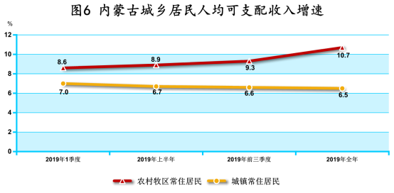 2019年,全區(qū)全體居民均可支配收入30555元,比上年增長(zhǎng)7.7%。按常住地分,城鎮(zhèn)居民均可支配收入40782元,增長(zhǎng)6.5%;農(nóng)村牧區(qū)居民均可支配收入15283元,增長(zhǎng)10.7%,比全體居民均可支配收入快3.0個(gè)百分點(diǎn)。