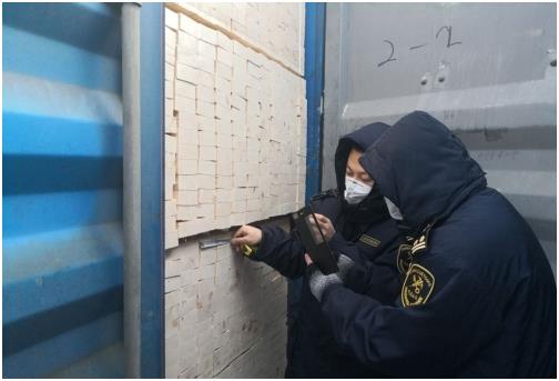 二連海關(guān)關(guān)員對進(jìn)口木材實(shí)施查驗(yàn)