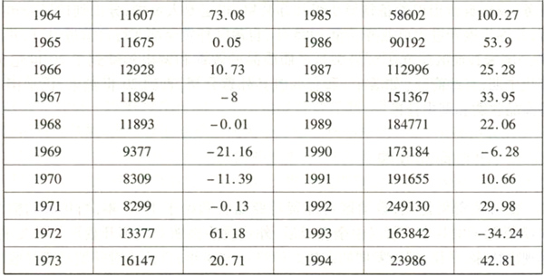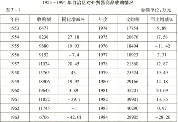 據(jù)有關(guān)資料記載,自治區(qū)對外貿(mào)易商品收購始于1953年,當年收購額為6447萬元。中共十一屆三中全會以后,外貿(mào)收購額隨著改革開放形勢的發(fā)展,呈現(xiàn)出快速、平穩(wěn)、健康發(fā)展的態(tài)勢。1953—1994年,自治區(qū)對外貿(mào)易商品收購額呈波浪式發(fā)展,并與國內(nèi)政治經(jīng)濟形勢發(fā)展及對外政策的變化息息相關(guān)。