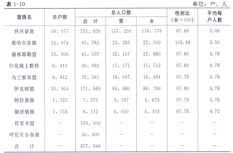 清末宣統(tǒng)年間對(duì)全國有一次較詳細(xì)的戶口調(diào)查,這時(shí)對(duì)蒙古族人口也有明確統(tǒng)計(jì),據(jù)查民國22年(1933年)《中國經(jīng)濟(jì)》年鑒修正民國元年內(nèi)務(wù)部匯造統(tǒng)計(jì)表的記載:內(nèi)蒙古蒙古族總?cè)丝谶_(dá)到877 946人,去掉已劃歸東北三省的蒙古族人口,按現(xiàn)在內(nèi)蒙古行政區(qū)劃范圍,實(shí)有828 977人。