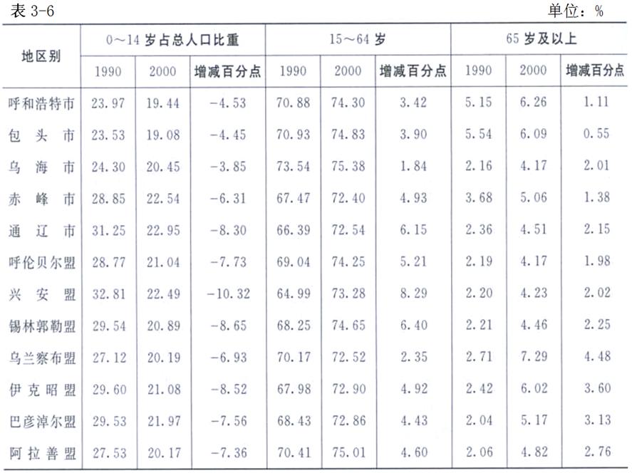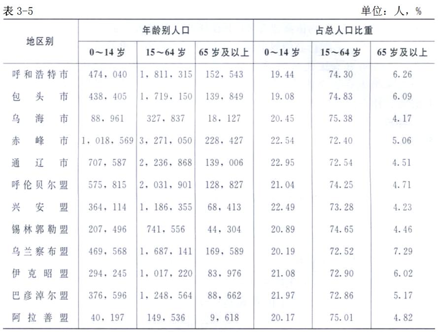 內(nèi)蒙古境內(nèi)各盟市,由于生育狀況、計(jì)劃生育開展程度不同,經(jīng)濟(jì)社會水平不同,以及自然環(huán)境的不同,人口壽命長短各異,人口年齡構(gòu)成有著較大的差異。