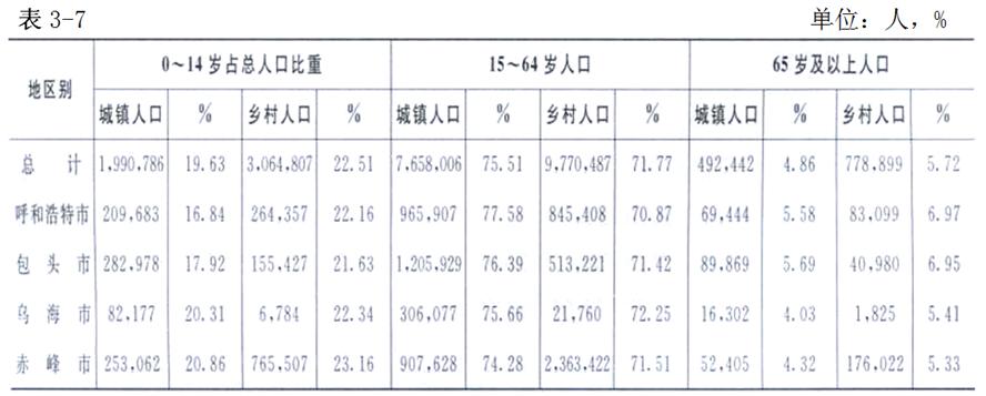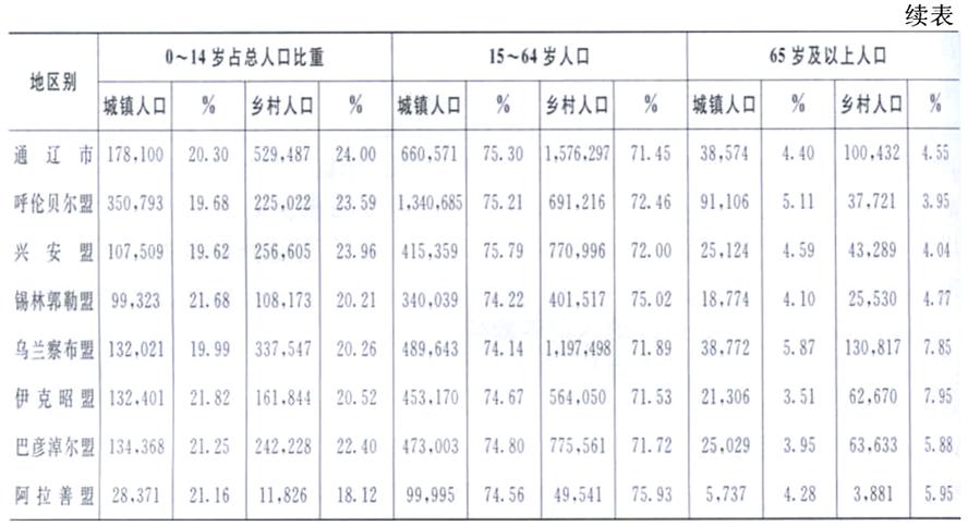 按城鄉(xiāng)劃分的人口年齡結(jié)構(gòu),由于經(jīng)濟(jì)社會文化、計(jì)劃生育生殖保健工作開展的程度不同,人口流動等方面的原因,各盟市之間也存在著明顯的差異。
