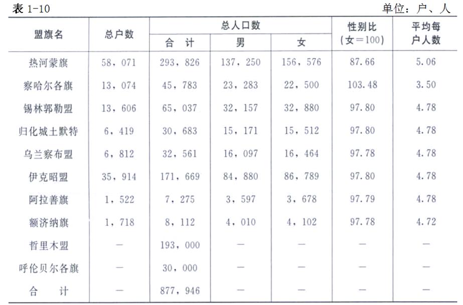 清末宣統(tǒng)年間對全國有一次較詳細(xì)的戶口調(diào)查,這時對蒙古族人口也有明確統(tǒng)計,據(jù)查民國22年(1933年)《中國經(jīng)濟》年鑒修正民國元年內(nèi)務(wù)部匯造統(tǒng)計表的記載:內(nèi)蒙古蒙古族總?cè)丝谶_(dá)到877 946人,去掉已劃歸東北三省的蒙古族人口,按現(xiàn)在內(nèi)蒙古行政區(qū)劃范圍,實有828 977人。