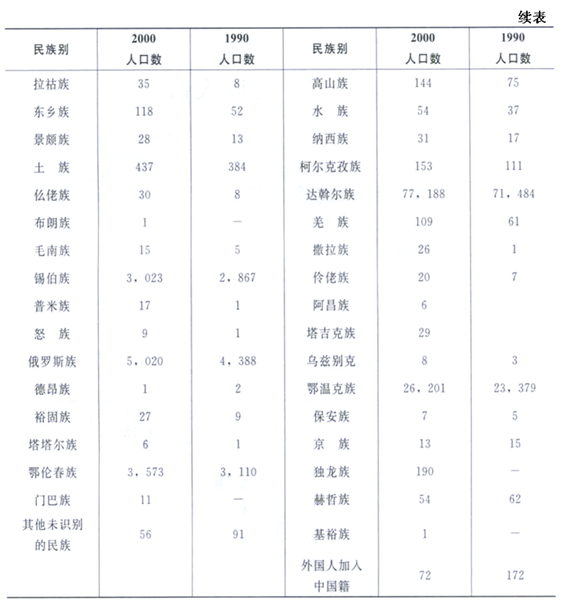 1982年后,部分原是漢族成分的人口改成了少數(shù)民族人口,如滿族人口1982年為237 149人,而到1990年增加到460 517人,8年增加人口223 368人,增長94.19%,依靠本民族人口自增是不可能增加這么多的,而主要是靠改變民族成分增加的。