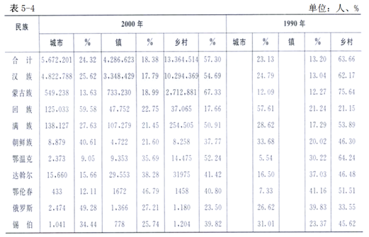 2000年,內(nèi)蒙古自治區(qū)境內(nèi)各民族人口城市、集鎮(zhèn),農(nóng)村牧區(qū)的分布有了明顯的變化,總的趨勢是城鎮(zhèn)人口增加,城鎮(zhèn)化的水平有了提高,城鎮(zhèn)人口增長快于農(nóng)村、牧區(qū)的人口增長。