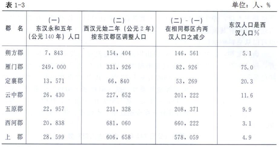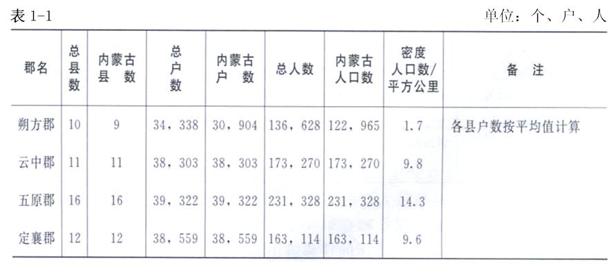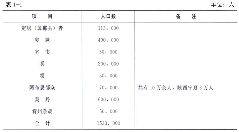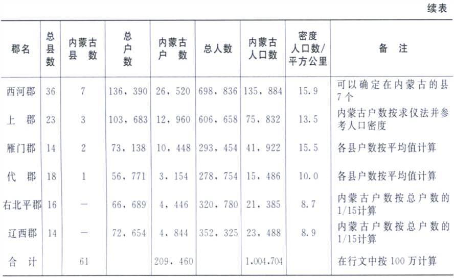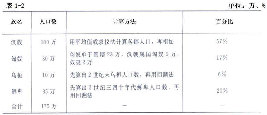 郡縣人口,主要是漢族,當(dāng)時生活在今內(nèi)蒙古地區(qū)的還有匈奴、烏桓、鮮卑等民族,大都分布在陰山北、大興安嶺西,不受郡縣管轄;主要以游牧為生,不納賦稅,不服徭役,故漢元始二年(公元2年)人口調(diào)查的數(shù)字,不包括當(dāng)時在內(nèi)蒙古的匈奴、烏桓、鮮卑等族人口。漢元始二年(公元2年)時內(nèi)蒙古地區(qū)除100萬漢族人口外,還有70余萬北方少數(shù)民族人口。