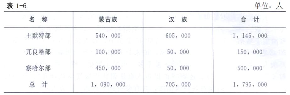 以阿拉坦汗為首的土默特部勢力最大,控制今伊、巴、錫、烏、阿五盟和呼包二市。他們擁有騎兵10.8萬,人口約54萬,土默川和鄂爾多斯有漢人15萬。其余地區(qū)的蒙漢人口按1∶1計算,則還有漢人45.5萬人,土默特部控制的漢族共約60.5萬人。于是這部分蒙漢人口合計為114.5萬。