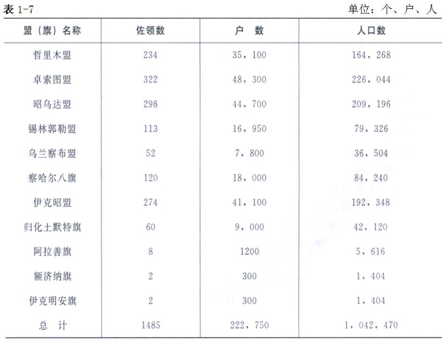 清乾隆三十五年(1770年)時內(nèi)蒙古地區(qū)的蒙古族總?cè)丝跒?SPAN lang=EN-US>1 042 470人,除去已劃歸東北三省的6個旗外,實際人口為832 572人。