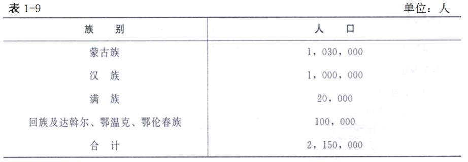 上表數(shù)字并不是當(dāng)?shù)孛晒抛蹇側(cè)丝冢话ú回?fù)擔(dān)兵役、徭役的喇嘛、黑徒(家奴)、鰥、寡、孤、獨等。清朝時喇嘛教盛行,最多時每個蒙古族家庭有兩男丁者抽一個當(dāng)喇嘛。在內(nèi)蒙古的47個旗中,每旗有召廟多者10多座至20多座,全內(nèi)蒙古有召廟900多座。清末時內(nèi)蒙古的上層喇嘛及喇嘛有12.8萬余人。乾隆年間的喇嘛,與清末差不多。再加上黑徒、鰥、寡、孤、獨等也有4萬~5萬人。此外,還有呼倫貝爾八旗是朝廷直接管轄的,有4769戶,29 713人。這樣內(nèi)蒙古各盟旗相加,共有蒙古族人口達103萬人。