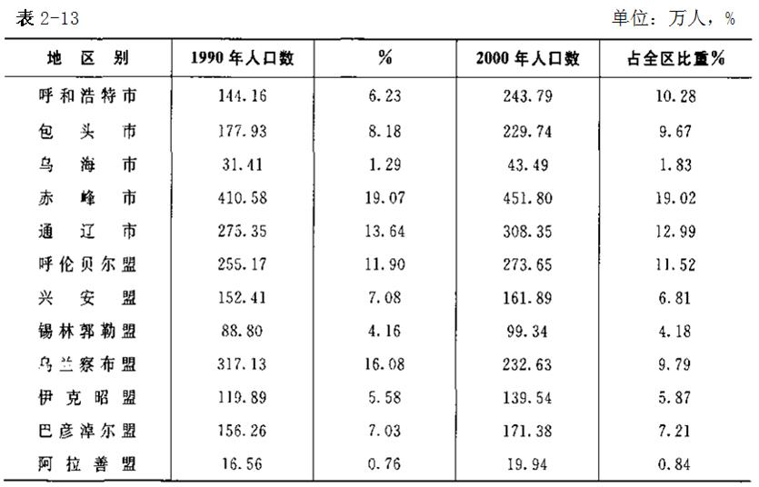 全區(qū)盟市人口最多的是赤峰市451.80萬人,占全區(qū)總?cè)丝诘?SPAN lang=EN-US>19.07%,但該市與1990年占全區(qū)總?cè)丝诘姆蓊~相比,降低了0.5個百分點(diǎn)。其次是通遼市308.35萬人,占全區(qū)總?cè)丝?SPAN lang=EN-US>12.99%,與1990年第四次人口普查時相比,占全區(qū)總?cè)丝诘姆蓊~基本維持原狀,由1990年的12.64%,增加到12.99%,10年只增長了0.35個百分點(diǎn)。各盟市人口在200萬以上的除了上述2個盟市外,還有呼和浩特市243.79萬、包頭市299.74萬、呼倫貝爾盟273.05萬和烏蘭察布盟232.63萬人,人口最少的是阿拉善盟有19.94萬人,占全區(qū)總?cè)丝诘谋壤沧畹停挥?SPAN lang=EN-US>0.84%;其次是烏海市2000年全市人口為43.49萬,占自治區(qū)總?cè)丝跒?SPAN lang=EN-US>1.83%,比1990年第四次人口普查時的1.29%,提高0.54個百分點(diǎn);再次是錫林郭勒盟2000年全盟人口為99.34萬人,占自治區(qū)總?cè)丝跒?SPAN lang=EN-US>4.18%,較1990年第四次人口普查時的4.16%,提高0.12個百分點(diǎn)。1990—2000年人口占全區(qū)總?cè)丝诒壤鲩L最快的是首府呼和浩特市,由1990年的6.23%,上升到2000年10.28%,10年上升了4.05個百分點(diǎn),平均每年上升0.40個百分點(diǎn)。其次是包頭市,由1990年占全區(qū)總?cè)丝?SPAN lang=EN-US>8.18%,增長到9.67%,增長1.49個百分點(diǎn),人口占全區(qū)總?cè)丝诒戎叵陆底羁斓氖菫跆m察布盟,該盟人口1990年由317.13萬人下降到2000年的232.63萬人,下降84.5萬人,降低36.32%,占全區(qū)總?cè)丝诒戎赜?SPAN lang=EN-US>1990年的16.08%,降到9.79%,下降了6.29個百分點(diǎn)。人口減少的主要原因有兩個:一是行政區(qū)域變動,1990—2000年,烏蘭察布盟的武川縣、和林格爾縣、清水河縣、達(dá)茂旗,相繼劃入了呼和浩特市和包頭市;另一個是農(nóng)村、牧區(qū)貧困人口大量遷入城市和其他地方造成的,而不是自然減少的原因。1990~2000年中占全區(qū)總?cè)丝诒戎販p少的還有呼倫貝爾盟、赤峰市、興安盟等幾個盟市,不過這幾個盟市人口占總?cè)丝诒戎?SPAN lang=EN-US>10年中減少的并不像烏蘭察布盟那樣大,10年減少的比重都沒有超過1個百分點(diǎn)。