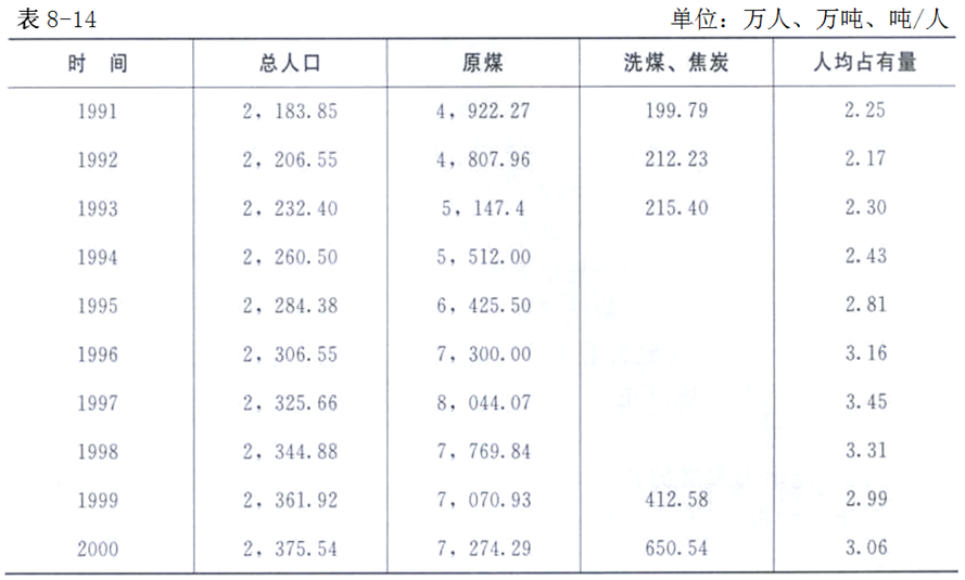 1991—2000年,內蒙古自治區(qū)煤炭產量,總體上是穩(wěn)定發(fā)展的,沒有出現大起大落的現象。1992年全區(qū)煤炭產量為4807.96萬噸,比1991年減少114.31萬噸,10年中全年煤炭產量最高的年份是1997年,這一年煤炭產量達到8044.07萬噸,比1991年增加3121.8萬噸,增長63.42個百分點;2000年,內蒙古自治區(qū)煤炭產量為7274.29萬噸,雖不及1997年的煤炭生產量,比1991年增加2352.02萬噸,增長47.78個百分點。從人均占有的煤炭產量來看,1991—2000年人均占有的煤炭產量最高年份是1997年為3.45噸;其次是1998年為3.31噸;再次是2000年為3.06噸。人均占有煤炭產量最低的是1992年為2.17噸;其次是1991年為2.25噸;再次是1993年為2.30噸。