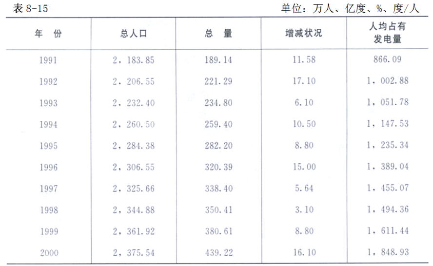 從人口與電力發(fā)展的關系方面的考察,人均占有的發(fā)電量大幅度的增長,從1991年人均占有866.09度,到2000年的1848.93度,人均發(fā)電量年增加982.84度,增長113.48%。