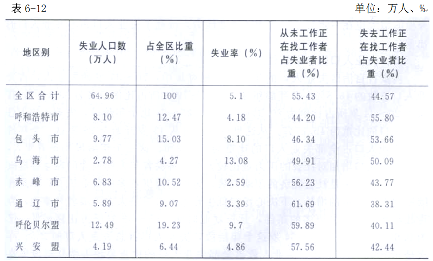 20世紀90年代后,內(nèi)蒙古自治區(qū)人口總量的不斷增加,勞動力資源存量增加,勞動就業(yè)崗位增加速度放慢,致使失業(yè)人口的現(xiàn)狀發(fā)生一系列變化。截至2000年11月1日,內(nèi)蒙古自治區(qū)失業(yè)人口達到64.96萬人,占不在業(yè)人口的12.66%,失業(yè)率為5.1%。