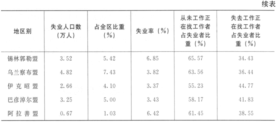 2000年,全區(qū)12個盟市中,有5個盟市失業(yè)率高于全區(qū)平均水平,其中失業(yè)率最高的是烏海市為13.08%,比全區(qū)平均值高出7.98個百分點;其次是呼倫貝爾盟(今呼倫貝爾市)為9.07%,比全區(qū)平均值高出4.60個百分點;再次是包頭市為8.10%,比全區(qū)平均值高出3.0個百分點,比全區(qū)平均值高出3個百分點。失業(yè)率最低的是赤峰市為2.59%,比全區(qū)平均值低2.51個百分點;其次是伊克昭盟(今鄂爾多斯市)為3.37%,比全區(qū)平均值低1.73個百分點;再次是通遼市為3.39%,比全區(qū)平均值低1.71個百分點。10年間內(nèi)蒙古自治區(qū)的勞動力資源雖然增長較快,但由于各級政府實施積極的就業(yè)政策,包頭市、呼和浩特市、烏海市等大中城市針對近幾年國有企業(yè)下崗職工增加的情況,實施再就業(yè)工程,使就業(yè)人員的規(guī)模也在同步擴大,從而有效抑制失業(yè)率的上升勢頭。同時,失業(yè)人口規(guī)模的增大也在一定程度上加重就業(yè)壓力,提高失業(yè)人口占不在業(yè)人口的比重。