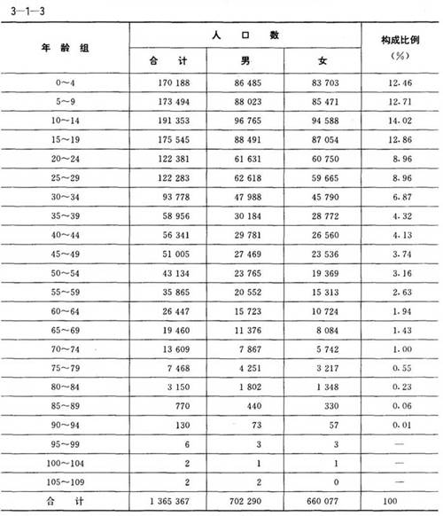 1990年,15~64歲的勞動(dòng)人口系數(shù)為63.87%;0~14歲組的少兒系數(shù)為32.81%,屬成年型;老化系數(shù)為3.32%,屬年輕型;老化指數(shù)為10.12%,屬年輕型;年齡中位數(shù)為27.80歲,屬成年型。