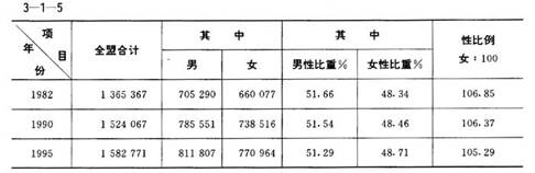 1995年,全盟總?cè)丝跒?span lang="EN-US">1582771人。其中,男性為811807人,女性為770964人,性比例為105.29。1995年與1990年相比,性比例下降1個(gè)百分點(diǎn)。