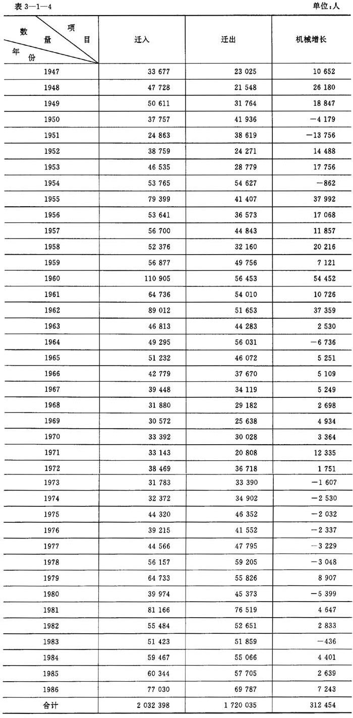 1947—1986年,遷入哲里木盟的人口達203.24萬,遷出172.0萬,機械增長31.24萬。其中1960—1962年增長幅度最大,增長10.25萬。出現(xiàn)負增長的年份有12個,主要集中在1973—1980年之間。