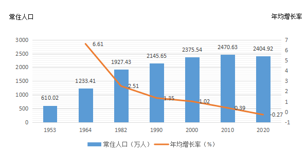全區(qū)常住人口與2010年第六次全國(guó)人口普查的24706321人相比,減少657166人,減少2.66%,年平均增長(zhǎng)率為-0.27%。
