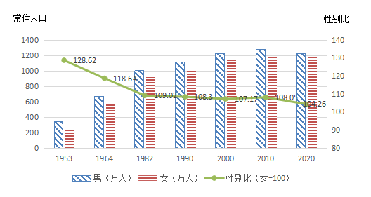 全區(qū)常住人口中,男性人口為12275274人,占51.04%;女性人口為11773881人,占48.96%。常住人口性別比(以女性為100,男性對(duì)女性的比例)為104.26,與2010年第六次全國(guó)人口普查的108.05相比,下降3.79。
