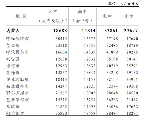 根據(jù)第七次全國(guó)人口普查結(jié)果,現(xiàn)將2020年11月1日零時(shí)自治區(qū)12個(gè)盟市常住人口[2]受教育基本情況公布如下: