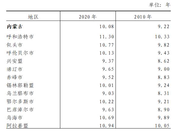 12個(gè)盟市中,平均受教育年限在10年以上的盟市有7個(gè),在9年至10年之間的盟市有5個(gè)。