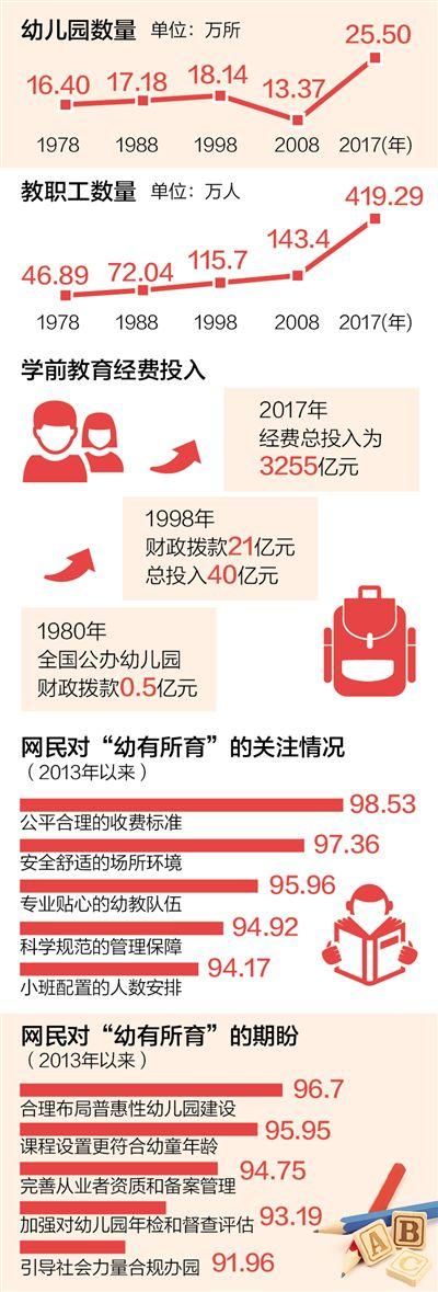 黨的十九大報告提出,在幼有所育、學(xué)有所教、勞有所得、病有所醫(yī)、老有所養(yǎng)、住有所居、弱有所扶上不斷取得新進展。改革開放40年來,學(xué)前教育蓬勃發(fā)展,從“不入園”到“想入園”,從“能入園”到“入好園”,“幼有所育”大步向前。