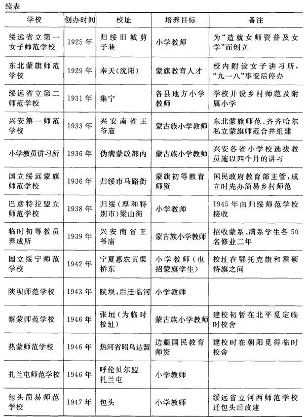 1908—1947年內(nèi)蒙古地區(qū)舉辦的師范學(xué)校、師范講習(xí)所一覽表