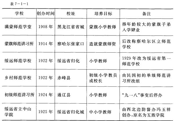 清光緒三十四年(1908),在東部地區(qū)創(chuàng)辦滿蒙師范學(xué)堂。此后,內(nèi)蒙古其他地區(qū)也陸續(xù)創(chuàng)辦一些培養(yǎng)師資的機(jī)構(gòu),如綏遠(yuǎn)省立第一女子師范學(xué)校、五原簡易師范學(xué)校、包頭簡易師范學(xué)校和開魯縣簡易師范講習(xí)所、通遼縣女子師范講習(xí)所、興安西省師道學(xué)校、翁牛特右旗師道學(xué)校、喀喇沁旗旗立崇德學(xué)校師范部等。