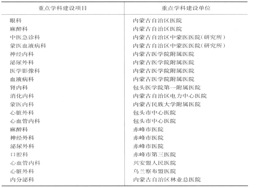 根據(jù)全區(qū)衛(wèi)生科技大會的有關(guān)精神,內(nèi)蒙古自治區(qū)衛(wèi)生廳于2001年5月,開始組織專家著手制定全區(qū)醫(yī)療衛(wèi)生學(xué)科建設(shè)和評審標(biāo)準(zhǔn)。2002年1月,內(nèi)蒙古自治區(qū)衛(wèi)生廳印發(fā)《內(nèi)蒙古自治區(qū)醫(yī)療衛(wèi)生學(xué)科建設(shè)規(guī)范(試行)》。成立專家委員會,確定學(xué)科建設(shè)項目評審原則,對學(xué)科建設(shè)申報項目進行認(rèn)真評審,共有162個各級醫(yī)療衛(wèi)生單位申請學(xué)科建設(shè)項目。